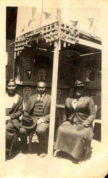 Photo: From right to left, Mrs. Willa Bruce, and her son, Harvey Bruce with his wife, Meda under a pop-up wooden tent structure that served as the early place of business for what became Bruce’s Lodge in Manhattan Beach, California, ca. 1912-1920. Photo: Photograph from the California African American Museum Collection featured in Living the California Dream: African American Leisure Sites during the Jim Crow Era, 2020 by Alison Rose Jefferson.